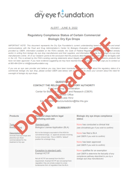 This document represents the Dry Eye Foundation’s current understanding based on telephone and email communications with the Food and Drug Administration’s Center for Biologics Evaluation and Research (CBER), information provided by CBER, information available on the FDA’s website, the Code of Federal Regulations, information provided verbally and/or in writing from biologic dry eye drop manufacturers and their suppliers, and information available from biologic dry eye drop manufacturers online. All of our research points to the conclusion that the products described below cannot currently be legally sold in the US. This is echoed by the FDA’s existing warning statements about illegally marketed regenerative medicine products that have not been approved. If you have evidence suggesting we may have reached this conclusion in error, we urge you to contact us at 800-484-0244 or info@dryeyefoundation.org.